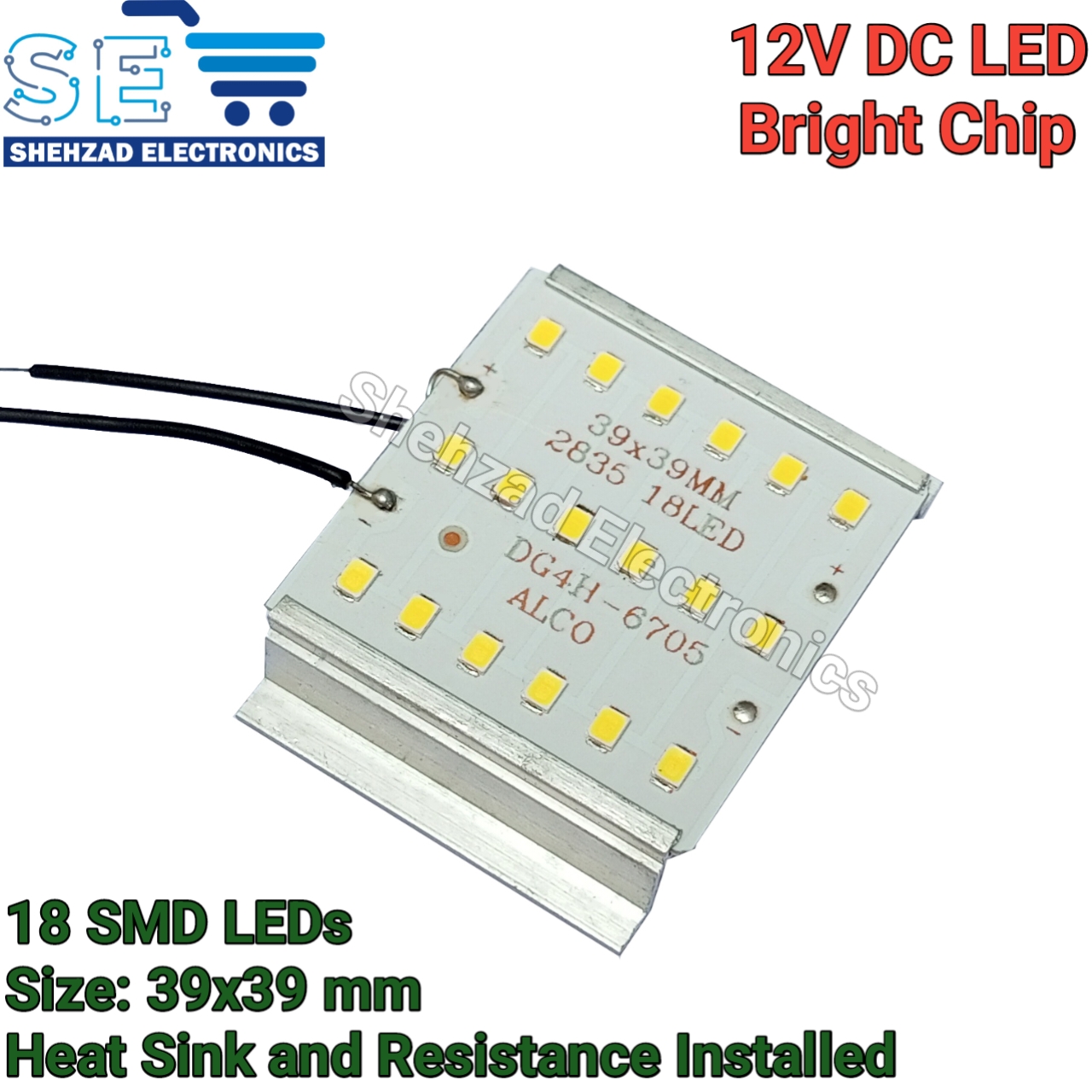 12V DC Ultra-Bright LED Chip with Heat Sink | 18 SMD LEDs | 39x39mm